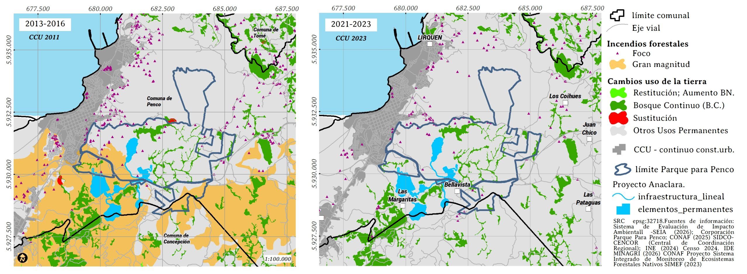 En la figura 13 a la izquierda los incendios 2013-2025. En amarillo el límite del Parque para Penco (PPP) y en abierta colisión en azul el proyecto de Tierras Raras de Anaclara S.A. A la derecha, los incendios del 18 de enero de 2026 en el Pencopolitano (Tomé, Concepción, Penco, Talcahuano), donde se aprecia la columna de humo que cubre toda la zona.