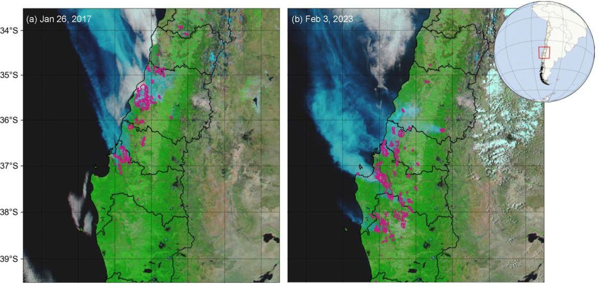 Imagen 5. Comparativa de la extensión espacial de los Mega-incendios de 2017 y 2023 en Chile central (Carrasco-Escaf, T. et al., 2024)